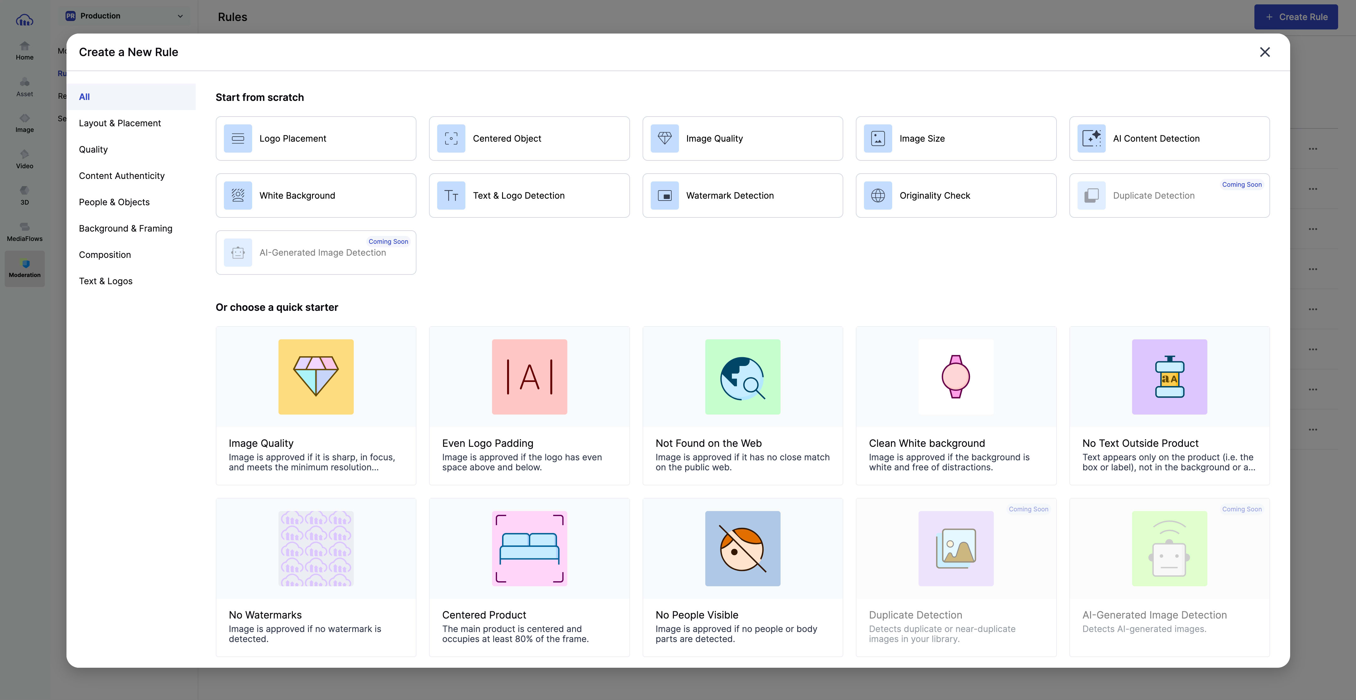 Start quickly with pre-defined rules that cover common quality, brand, and compliance checks. You can also add custom rules to reflect your specific brand guidelines as needed. -