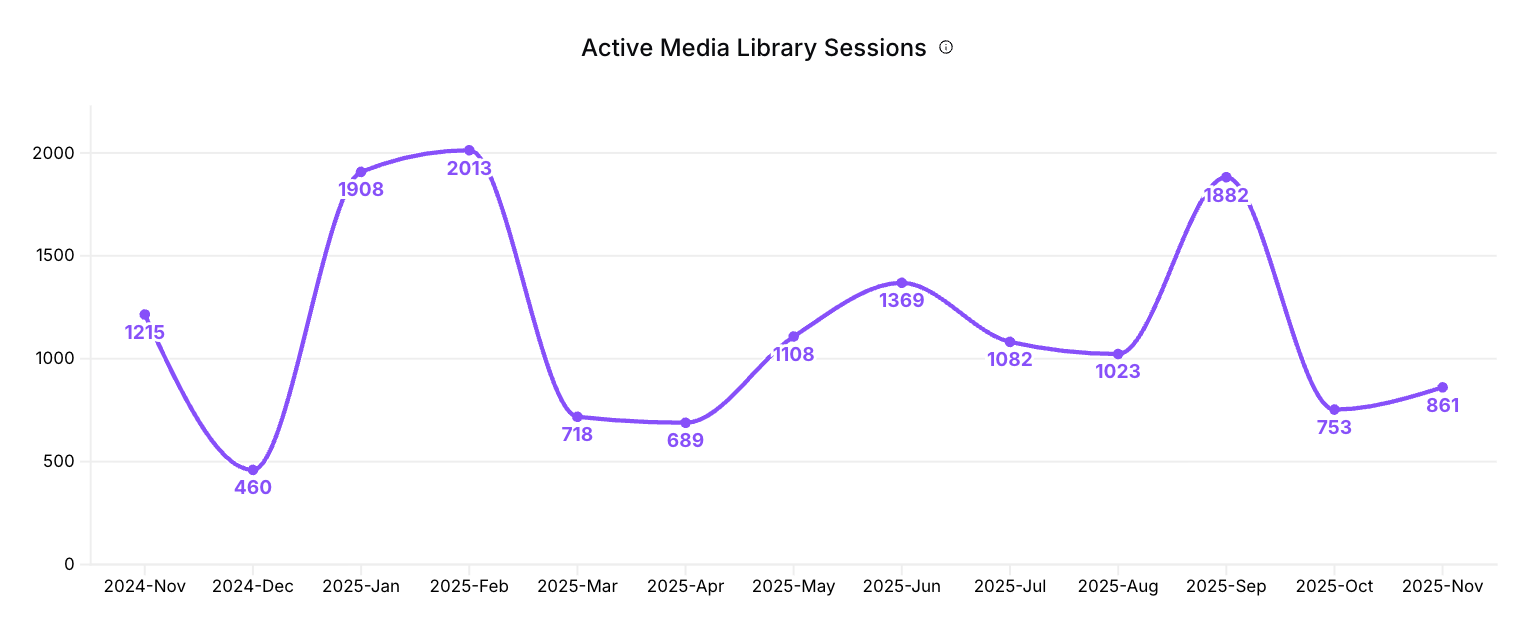 Shows the number of distinct sessions in the Media Library each month over the past 12 months. A session represents each time a user logs in and actively works in the Media Library until they log out or their session expires.