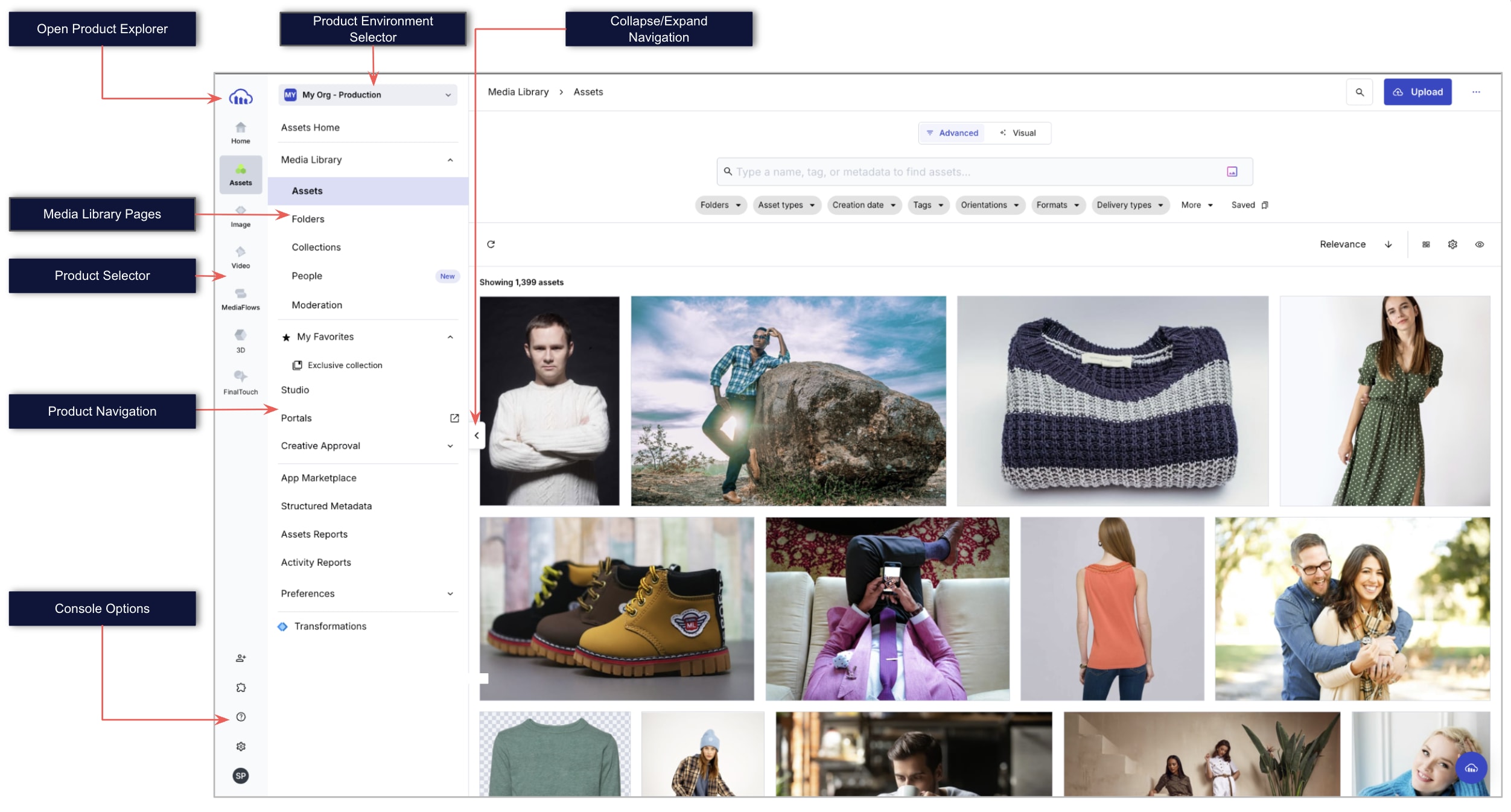 - Browse assets in different ways (all assets, by folder, by collection, by moderation status). For details, see Media Library pages.