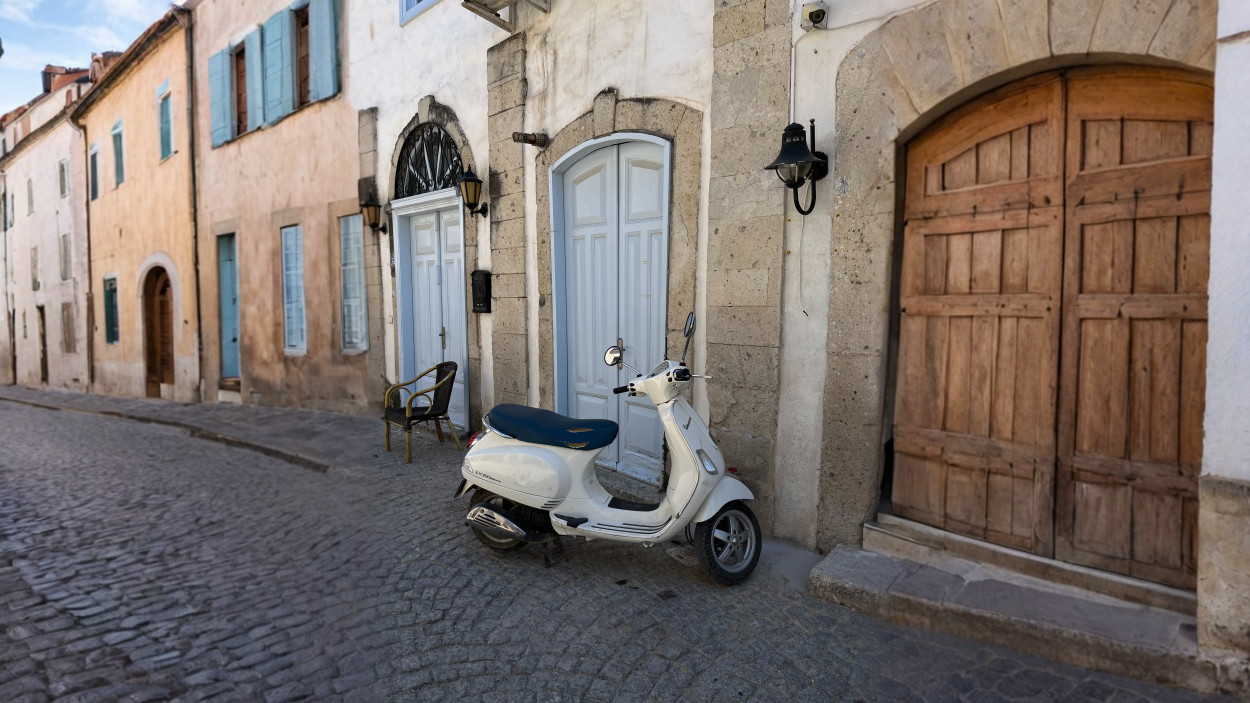 In this next example, the transparent background of the original image is replaced to give context to the motorbike (e_gen_background_replace:prompt_a%20deserted%20street
