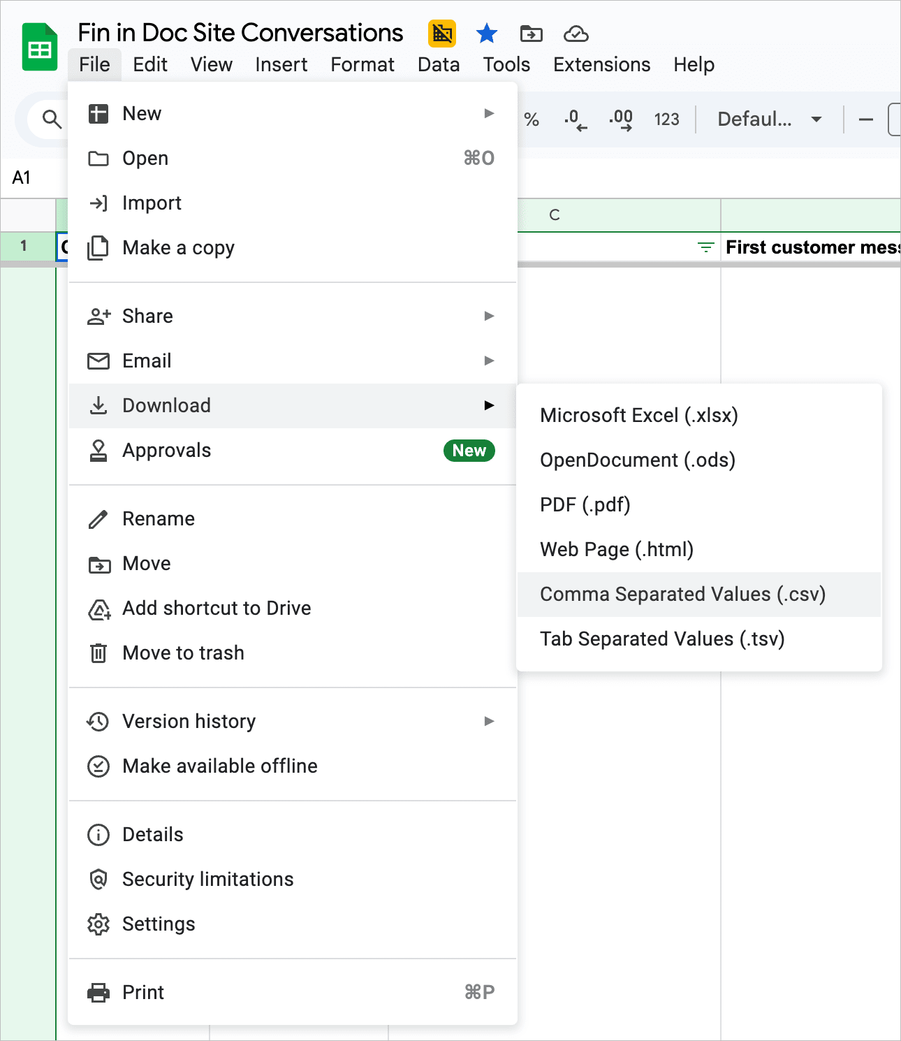 Export the latest Fin in Doc Site Conversations CSV file and rename it fin_conversations.csv.
