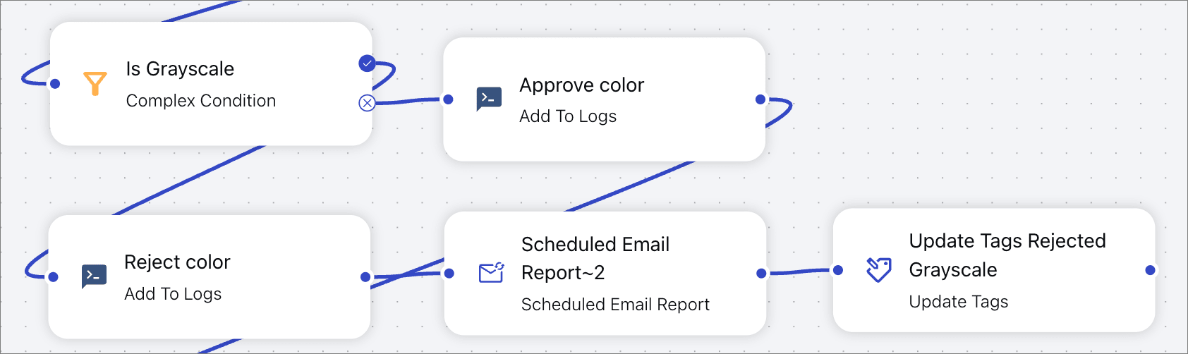 You can optionally connect Add to logs blocks to each of the outputs, and another Scheduled Email Report block to the rejection flow, with a message specific to the grayscale check. Note that the top output of the Complex Condition block indicates the true condition; in this case, that the image is grayscale.