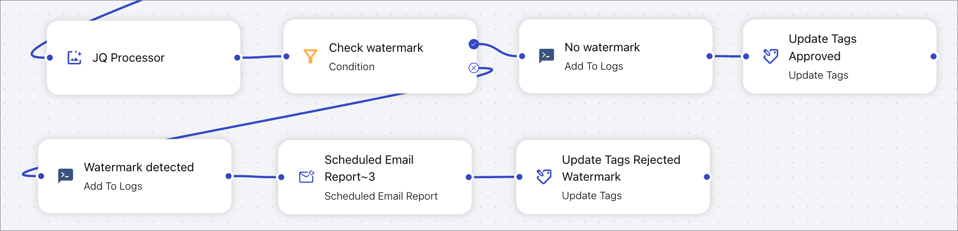 You can optionally connect Add to logs blocks to each of the outputs, and another Scheduled Email Report block to the rejection flow, with a message specific to the watermark detection check.