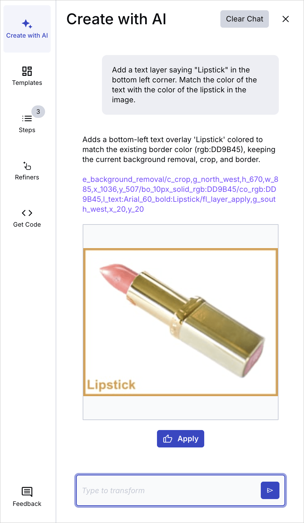 In the Create with AI tab, you can use natural language to describe how you want to edit the image. The chat suggests the transformations to apply with a preview of how the image looks with them applied. You can then choose to apply the suggestions to the preview image and automatically add them to the steps.
