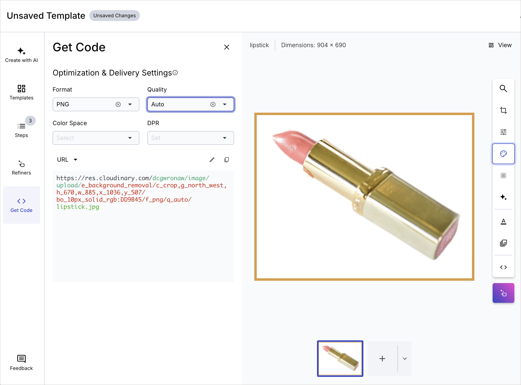 In the Get Code panel you can specify optimization and delivery settings. These are settings that don't change the preview image, but do impact the delivered image. You can also copy the URL or SDK code with these settings applied.