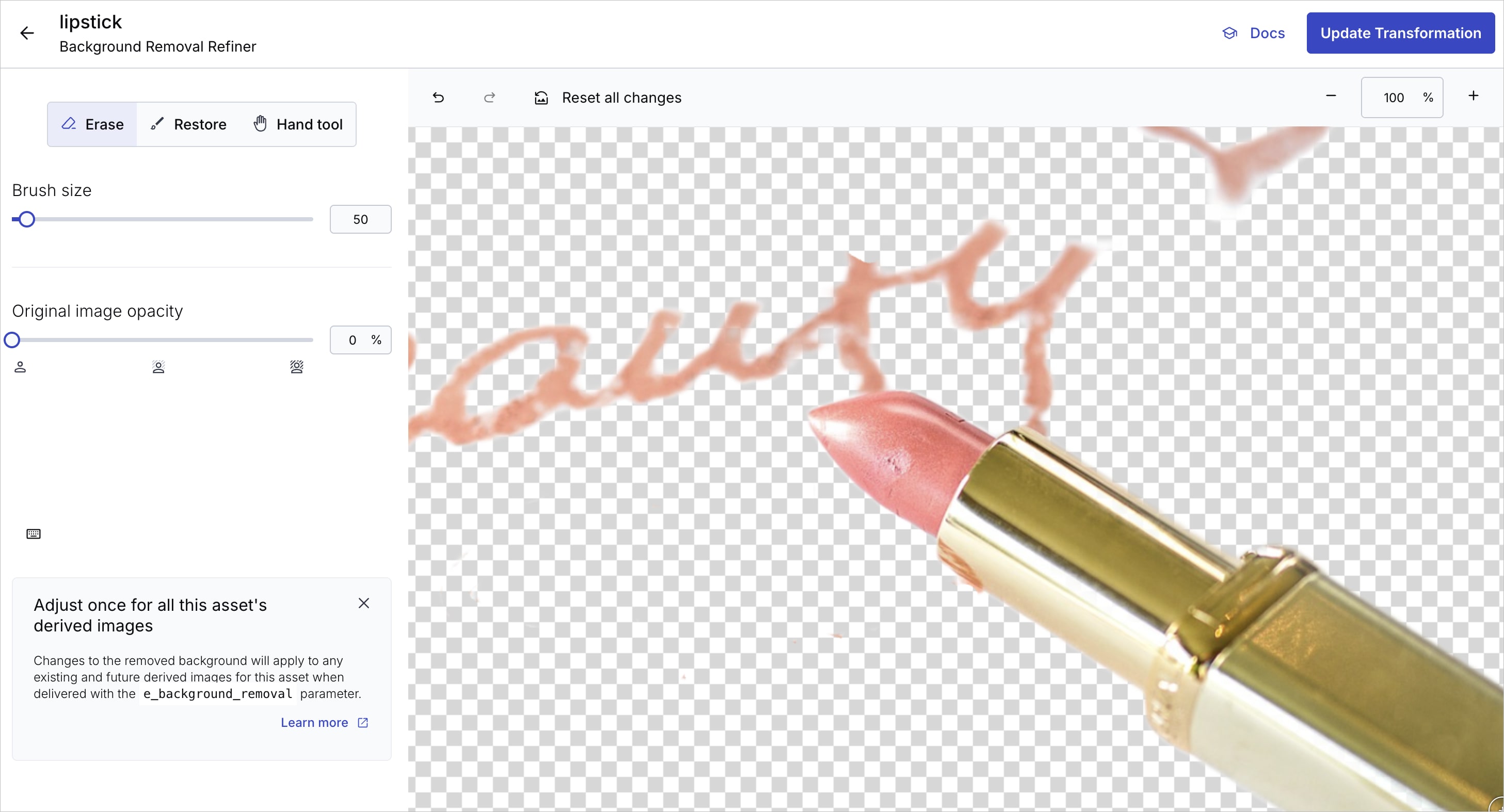 - Image Refiners: Use refiners to fine-tune your AI-powered transformed images, for example those with background removal, generative fill, and generative background replace, plus set your own focus areas.
