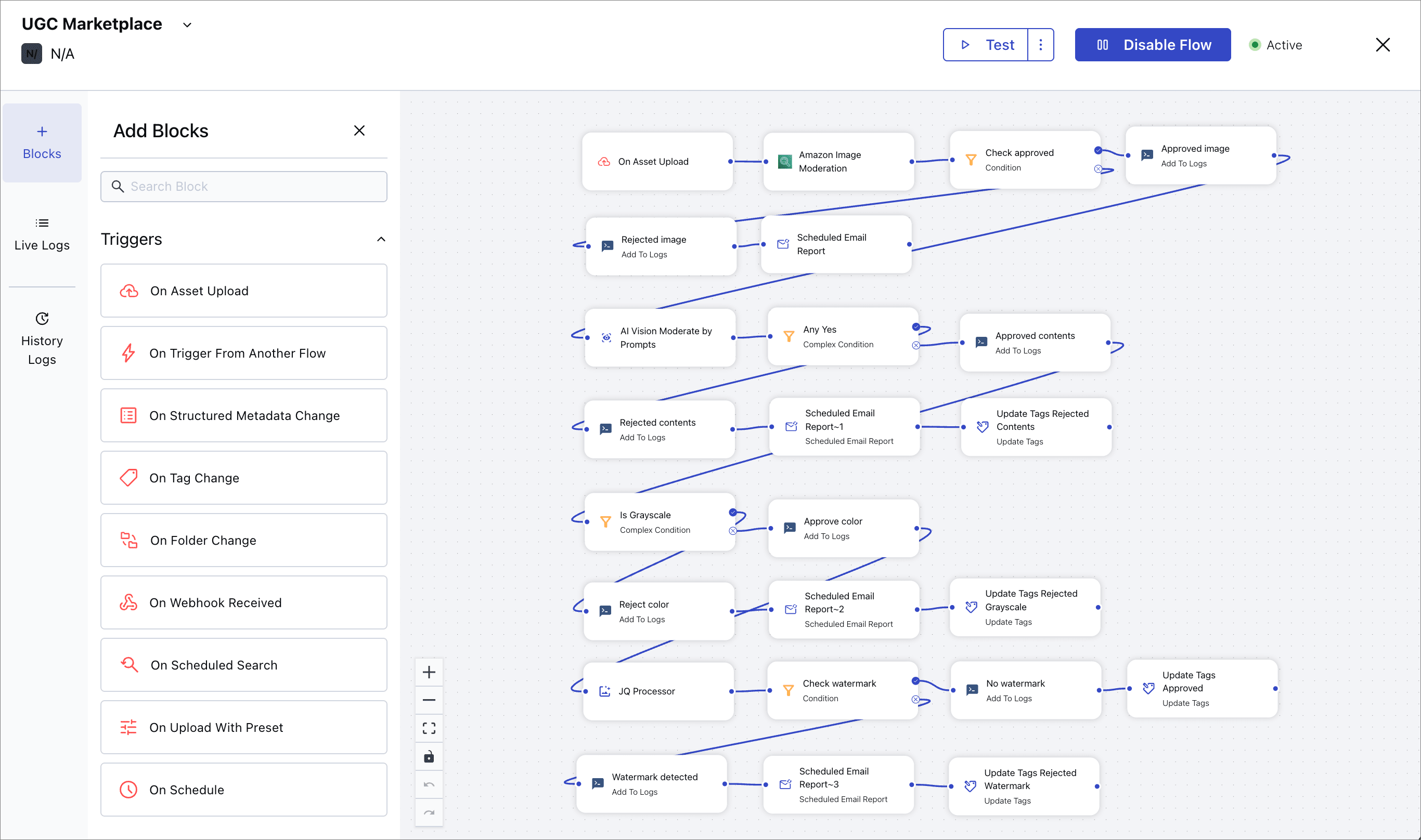A PowerFlow is a set of functional blocks that you connect together, creating step-by-step actions to execute. You can use blocks for a variety of actions, from interacting with media in Cloudinary, to sending notification emails. You can trigger flows in a number of different ways, for example, using webhooks, on a schedule, on asset upload, and more.