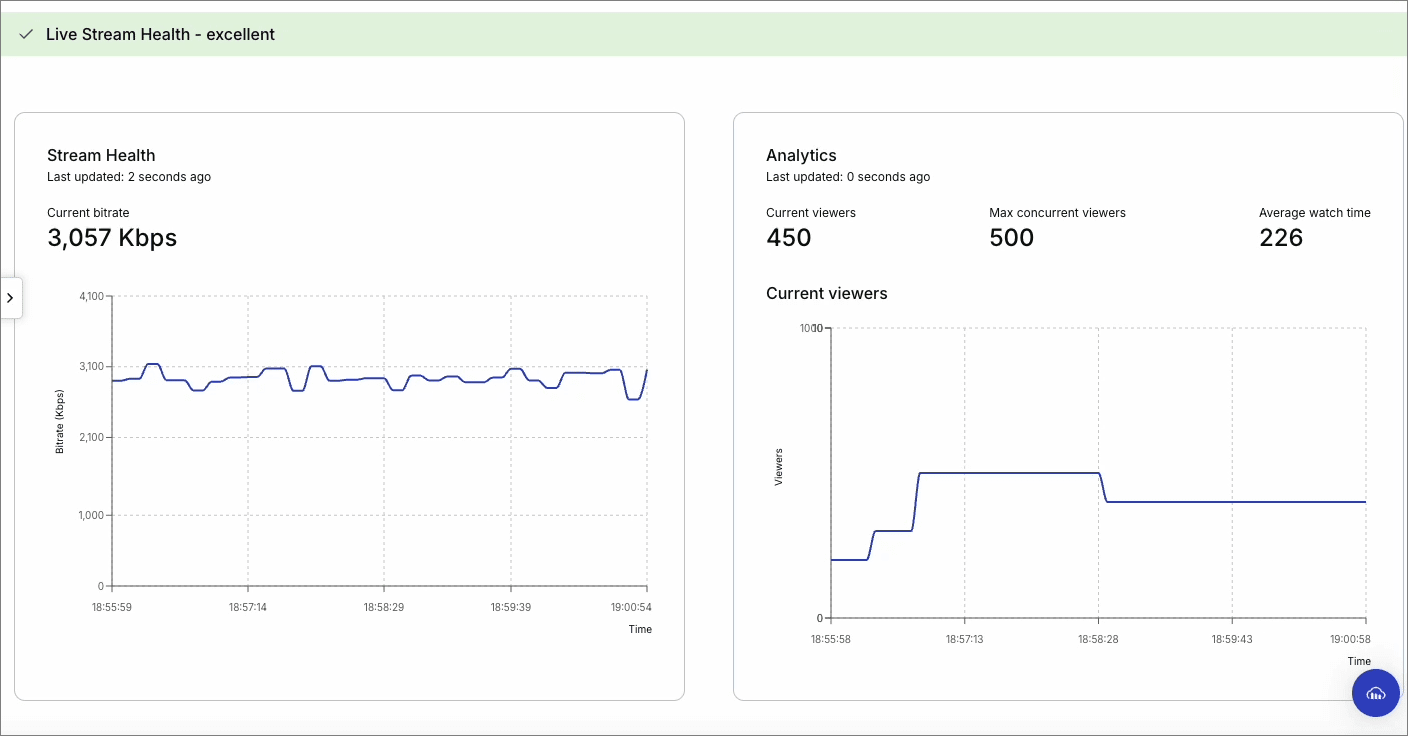 Alongside the existing live stream input health metrics, you can now view engagement metrics for your live streams. This enables you to track metrics such as viewer counts, the average view duration, and the number of concurrent viewers.