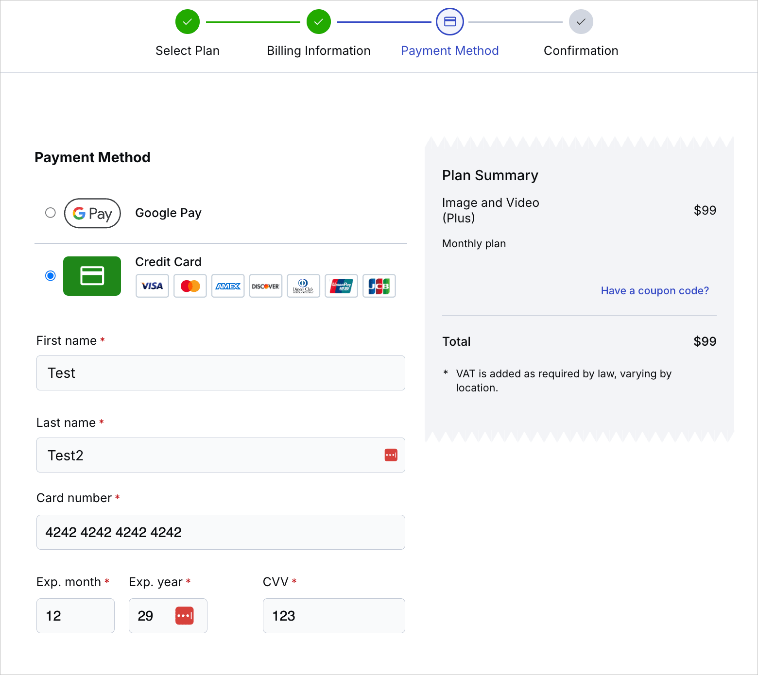 For this last step, you will see a summary of the plan you are going to subscribe to and a form to fill up your credit card details: