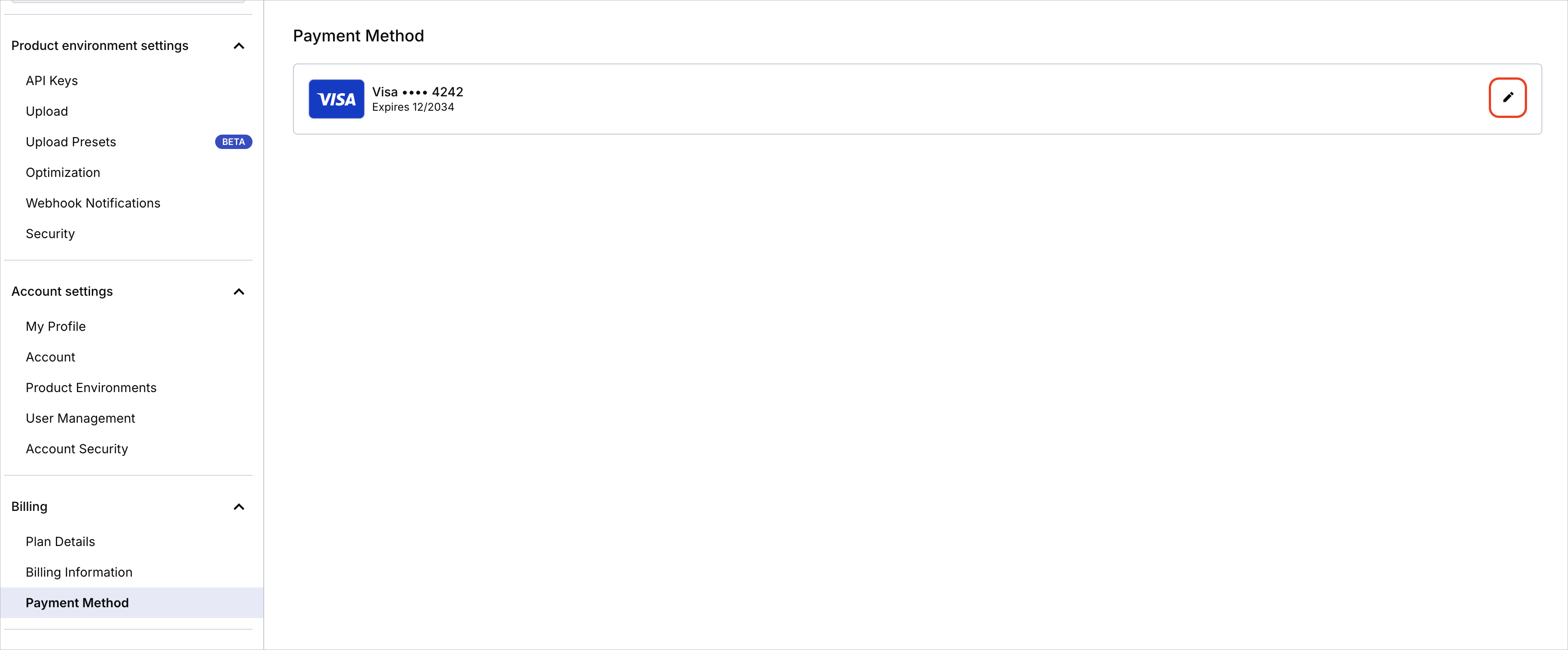 To update your credit card, you can go to the Payment Method page under the Billing section of your account settings or directly via the following link: https://console.cloudinary.com/settings/billing/payment_method